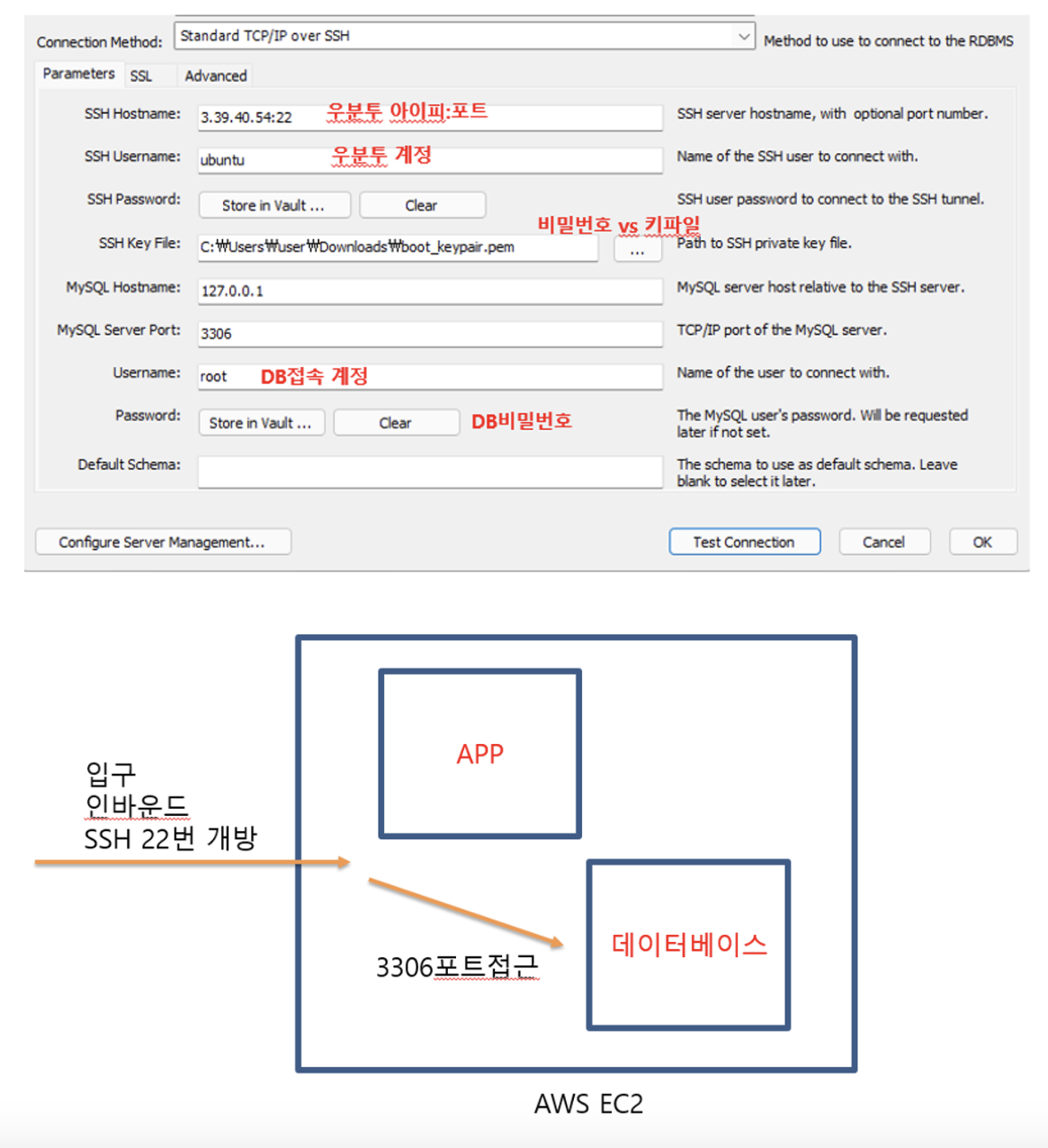 3306포트는 개방하지 않고 리눅스에 ssh로 접속하여 mysql로 접근할 수 있습니다. (보다 안전)